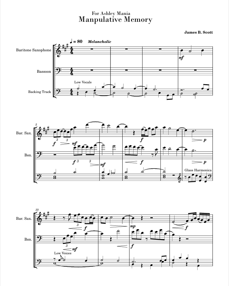 Manipulative Memories is a work for Bassoon, Bari sax, and pre-recorded audio that seeks to explore the emotional trauma of a falling raindrop. This raindrop happens to have major separation anxiety and aren’t exactly keen on just falling out of their cloud. Before they know it they’re falling with those around them and the feelings and thoughts come rushing in. This piece also attempts to capture the feelings of enmeshment, or a relationship dynamic where personal boundaries are blurred or nonexistent, causing extensive emotional closeness and a lack of individual self.